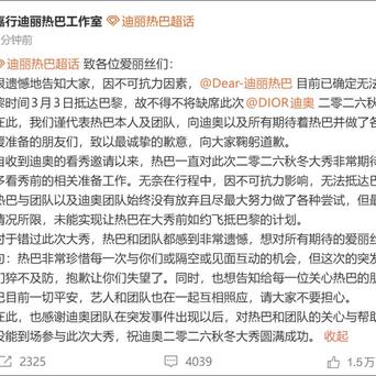 迪丽热巴被曝滞留迪拜,工作室发文:因不可抗力,确定无法抵达巴黎,不得不缺席时装周